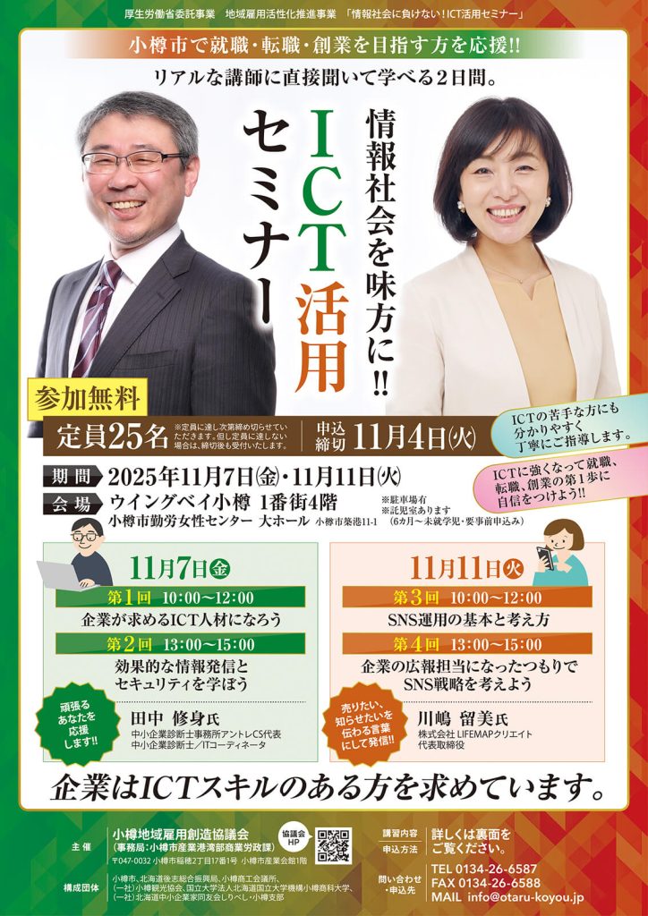 私たちの仕事 プロモーション(現在募集中の企画も含む) 【募集中】おたるキャリアサポート「たるキャリ」求職相談者を募集しています! 2025/11/14 【募集終了】令和7年度「通年雇用支援セミナー」受講者を募集しています! 2025/11/13 【募集終了】【小樽地域雇用創造協議会】「情報社会に負けない!ICT活用セミナー」受講者を募集しています! 2025/11/04 【募集終了】北海道応援大使プロジェクト選手交流会2025 入場整理券申込を開始しました!【ファイターズ】 2025/10/14 【募集終了】小樽地域遺産フォーラム「2038年小樽ビジョン」を開催いたします。 2025/09/30 【募集終了】【小樽地域雇用創造協議会】即戦力を目指す!パソコン講座(応用編)受講者を募集しています! 2025/08/01 プロモーション(現在募集中・募集終了企画) 一覧 > レポート 【小樽再発見の旅】本間哲平氏によるプレミアムセミナーを実施いたしました! 2024/11/19 【小樽再発見の旅】重要文化財カフェ 第3回・第4回を実施いたしました! 2024/11/19 【小樽再発見の旅】まち歩きCコース「『小樽めし』を堪能するツアー」を実施いたしました! 2024/10/22 レポート一覧 > コラム Coming Soon 1901/01/01Coming Soon 1901/01/01Coming Soon 1901/01/01 コラム 一覧 >